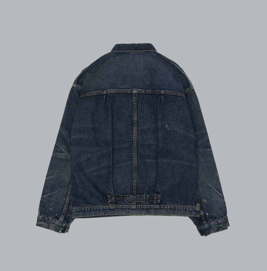 1941〜1942年に作られたデニムジャケットがベース。シルエットはドロップショルダー、太い袖、絞りの無い寸胴な身頃が特徴。希少なT-BACK*ディテールを採用。運針や縫い方向などの縫製やディテールは、当時をベースにしつつも現代的な強度を加え、着丈やアームホールなどのシルエットについても現代的な微調整を加えた。選抜された職人が通常行わない工程にまで踏み込んだ2026年SSバージョンのヴィンテージ加工により、ペンキが飛んだリアルな汚れや所有者が着用し続けて現れた色落ちも忠実に再現している。 *背中がTの字にセパレートされた仕様。本来、生地1枚で取る後身頃をサイズが大きくなる対応として2枚の生地を背中心で接いだことによる。