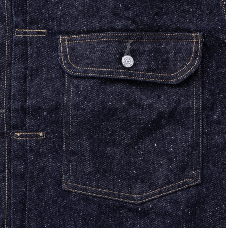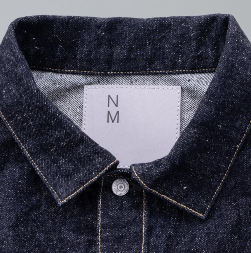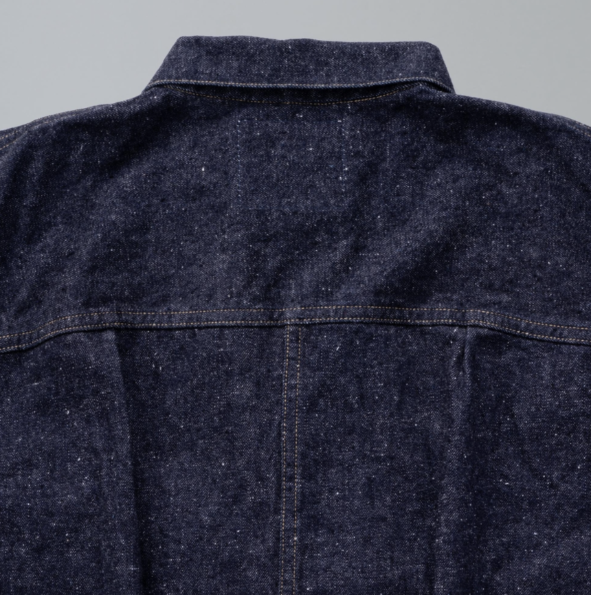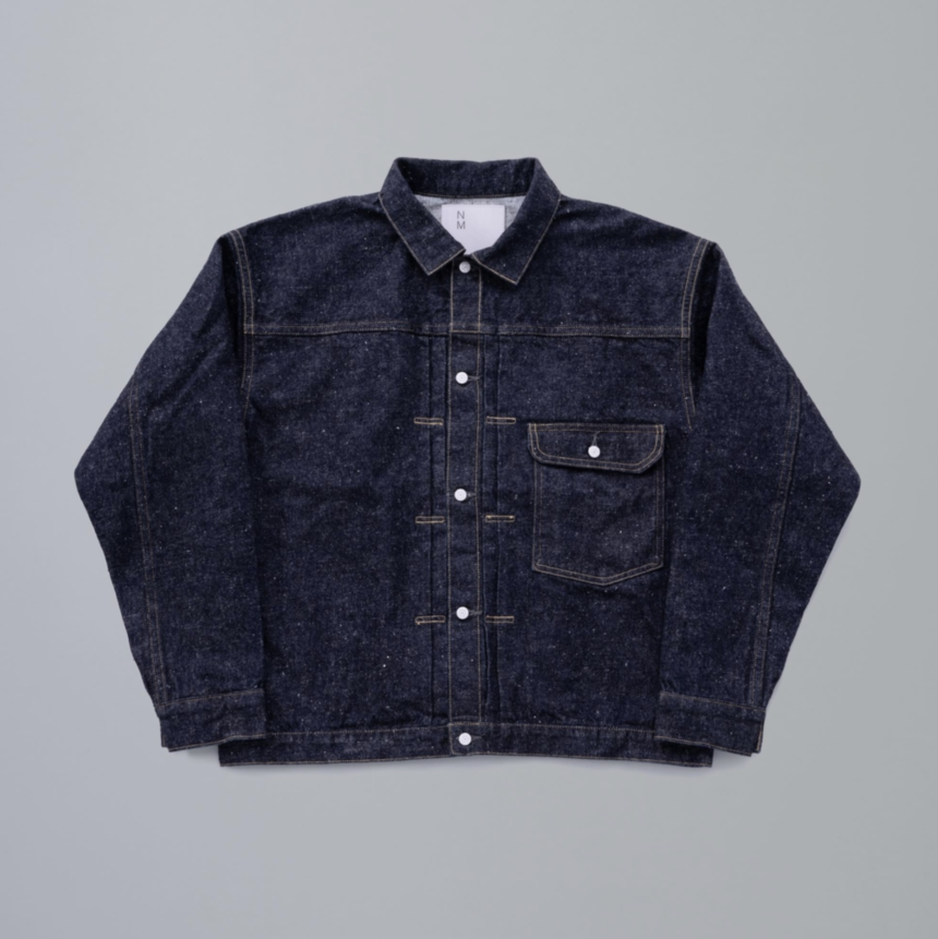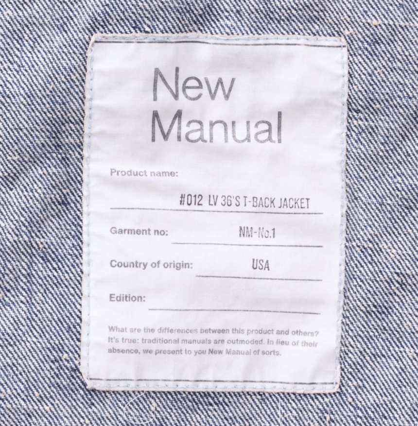 1936年以前のデニムジャケットがベース。このジャケットは小釦と言われる通常より1回り小さい釦が使用されているほか、襟も小さく、丸みのある歪んだ形状のポケットフラップなど随所のディテールが極めて特徴的。このタイプのT-BACKディテール*は藤原が知る限り日本で1着のみ。 今回はあえて大きめの48サイズを採用したほか、アームホールもやや大きく微調整することで重ね着もしやすくなっている。NMオリジナルデニムを使用。これをNew Manual#012とする。 *背中がTの字にセパレートされた仕様。本来、生地1枚で取る後身頃をサイズが大きくなる対応として2枚の生地を背中心で接いだことによる。