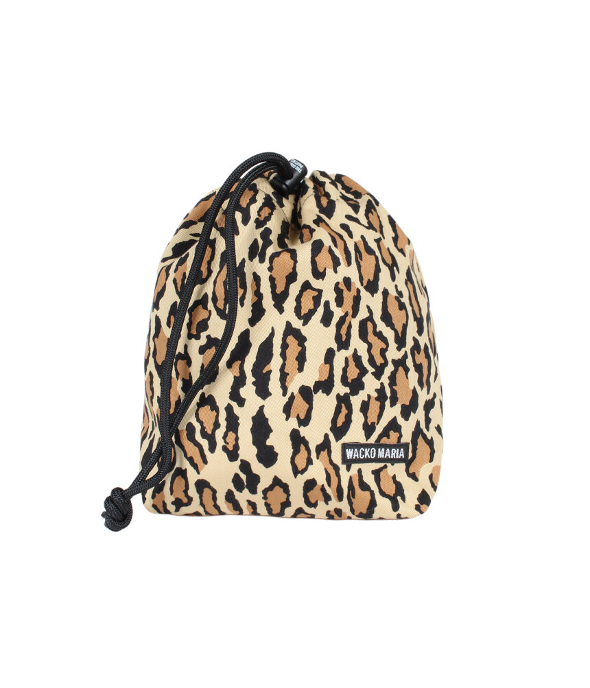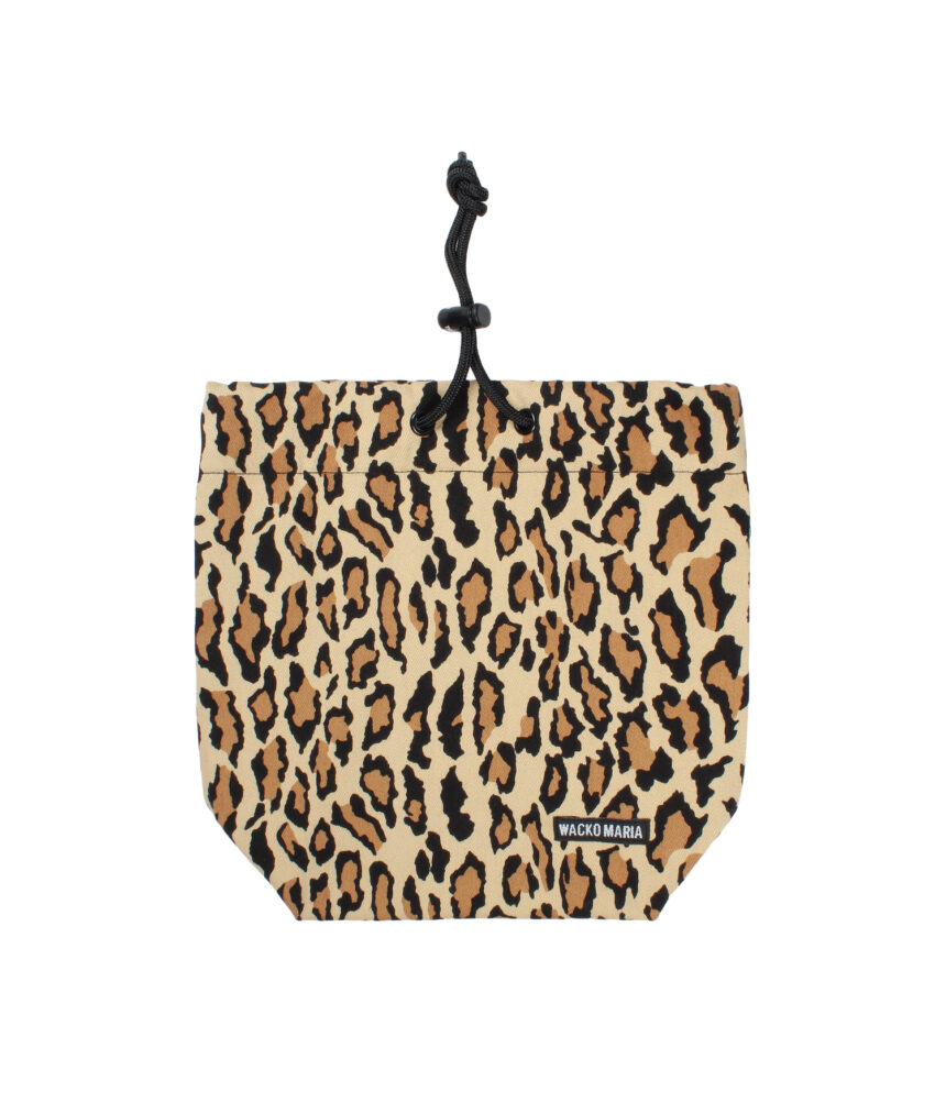 表地にレオパード柄のコットン生地、裏地にナイロンを使用した実用性の高い作りの巾着バッグ。