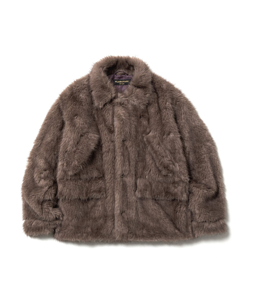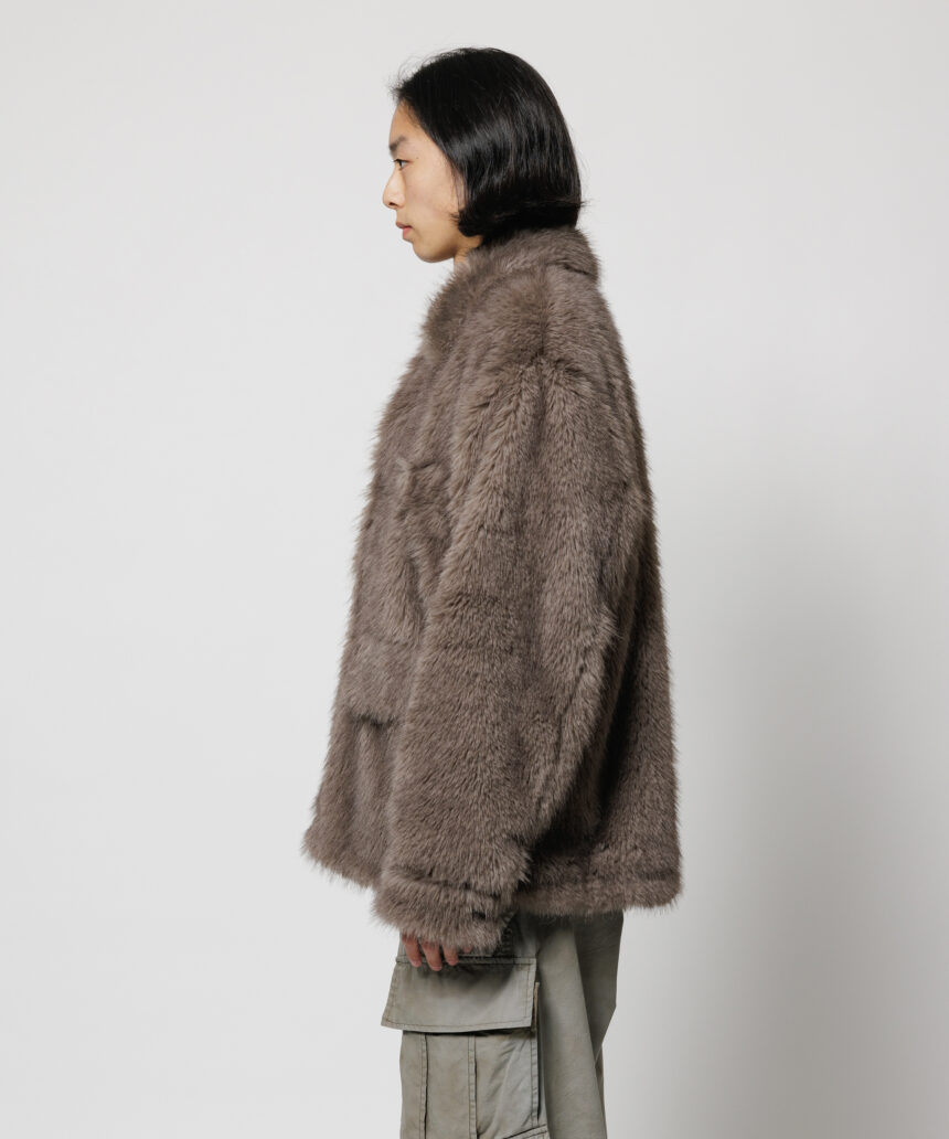 ・毛足の長い、リアルな獣感のあるエコファーを採用。 ・配色の裏地がアクセント。ややゆとりのあるシルエット ・前身頃左右2個ポケットを配置し、実用性も兼ね備えている。