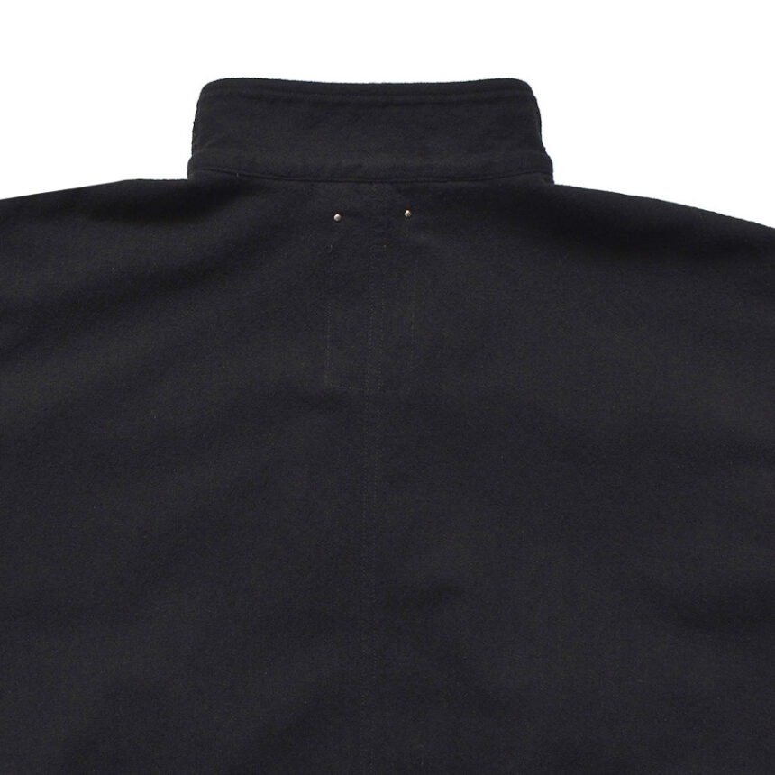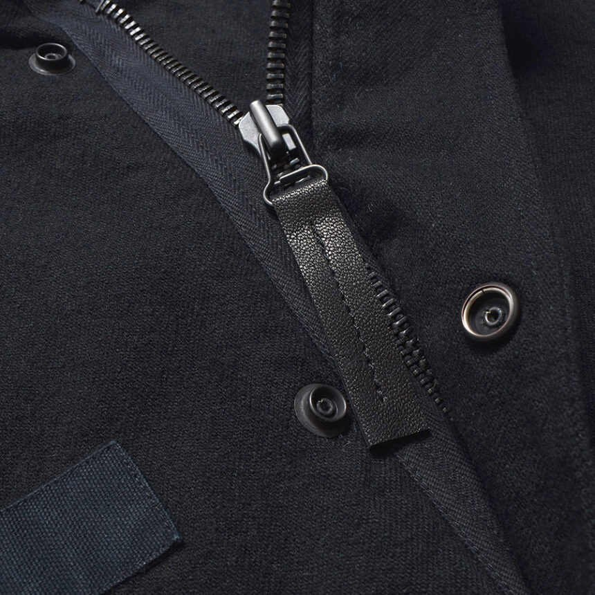 敢えてコットンウールファブリックで製作し、ファスナーやドローコードなどのパーツはもちろんのこと、補強布にレザーパーツを用いるなどオリジナリティも表現。