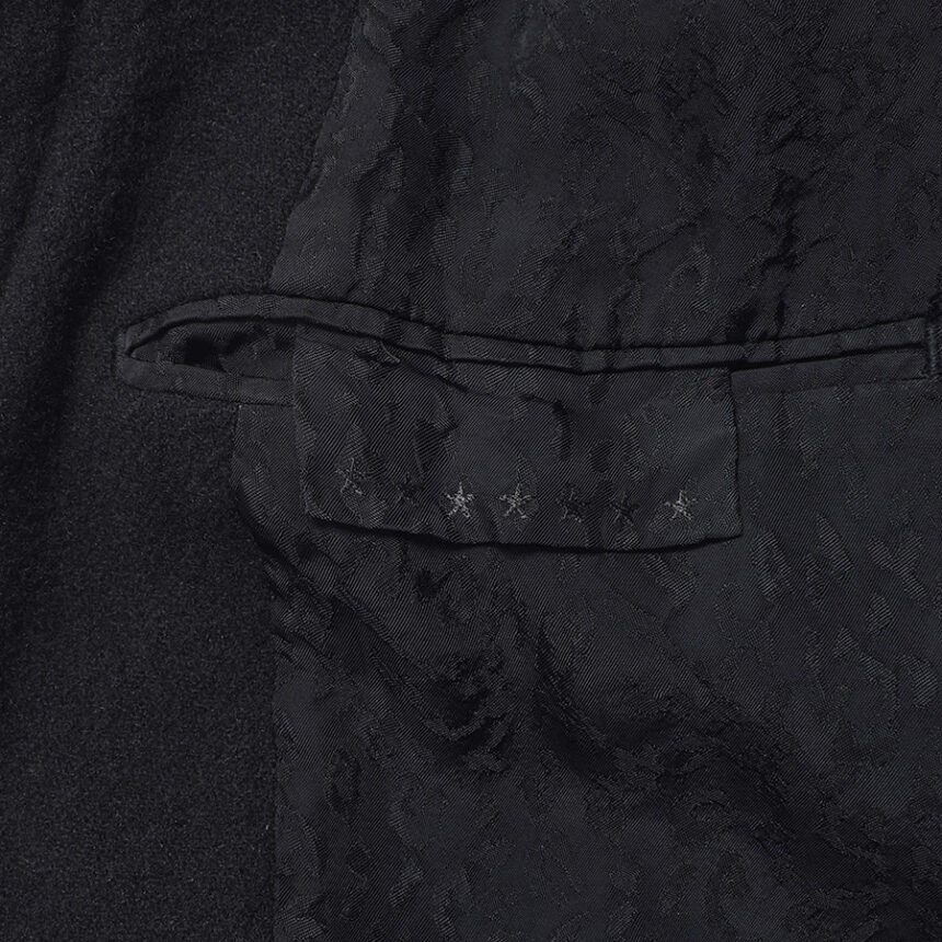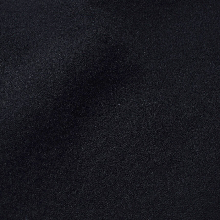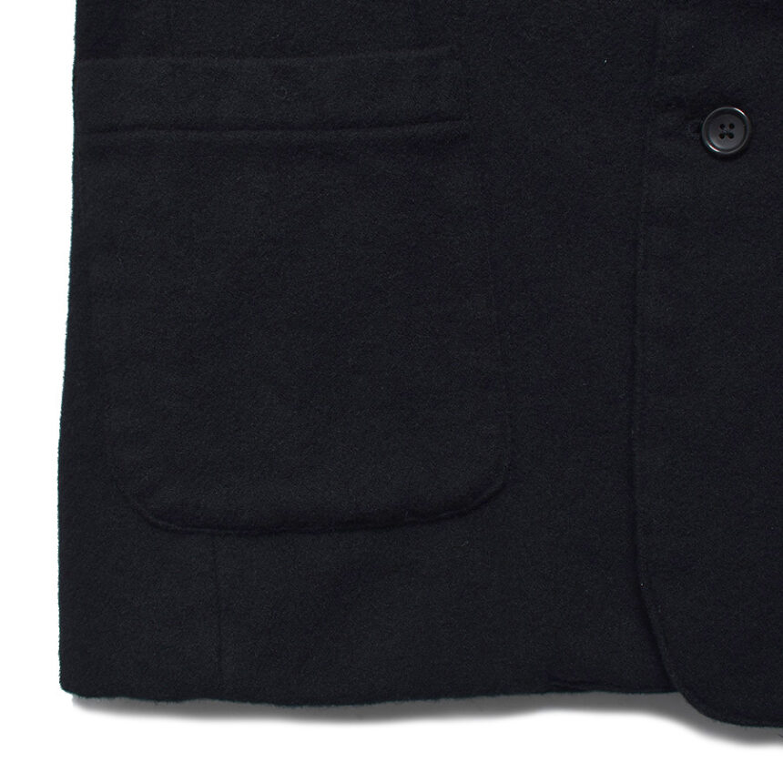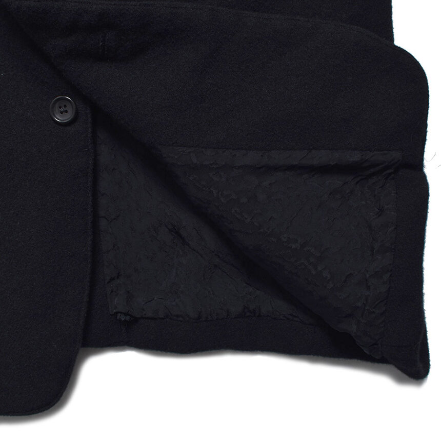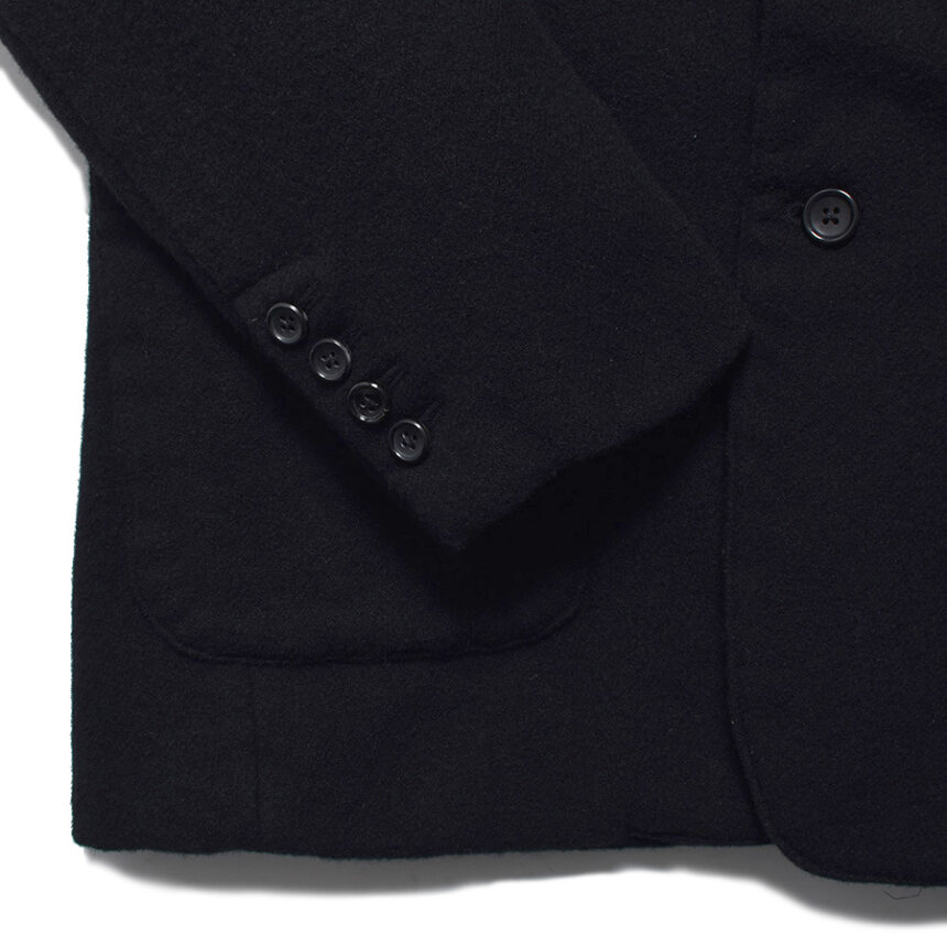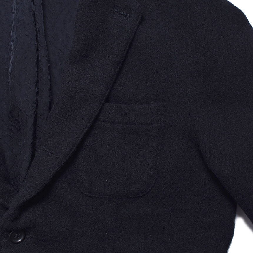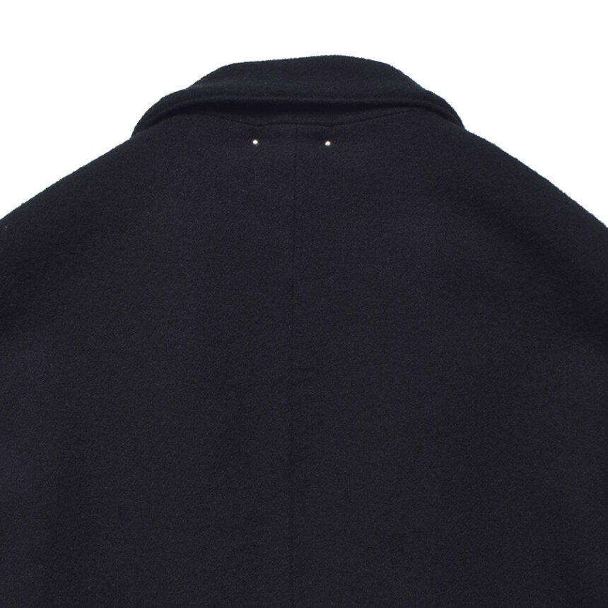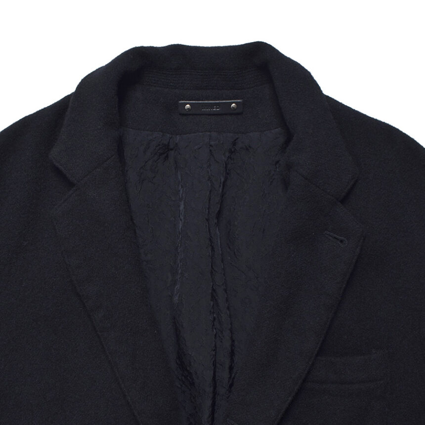 毛芯などを使用しない脱構築的な仕様で仕立てた後に縮絨加工を施し、柔らかい風合いとシュリンクウール特有の質感を持たせている。
