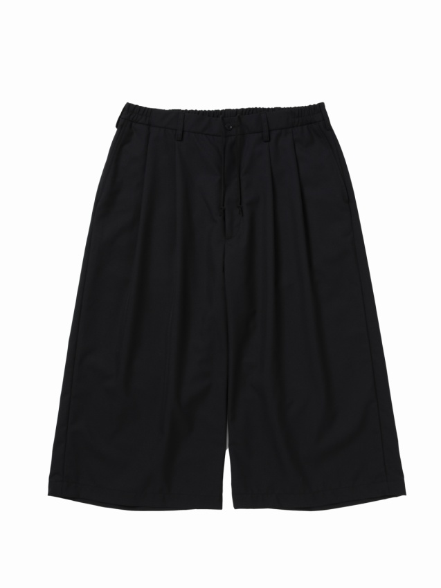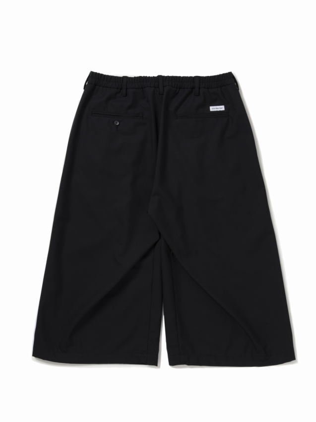 ・ウール、ポリエステルの混紡糸の高密T/Wサキソニーを使用。 ・クリアな光沢と程よいドレープ性を持つ。 ・表地撥水加工。 ・ハンドウォッシャブル。 ・ドローストリングのバックゴムイージー仕様。前開き有り。 ・2タックの8分丈ワイドシルエット。