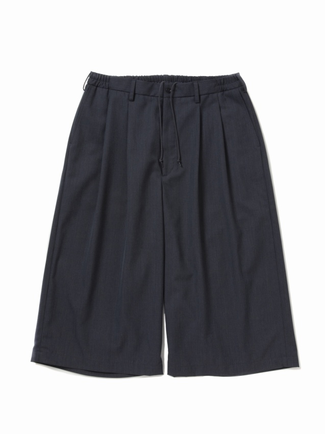 ・ウール、ポリエステルの混紡糸の高密T/Wサキソニーを使用。 ・クリアな光沢と程よいドレープ性を持つ。 ・表地撥水加工。 ・ハンドウォッシャブル。 ・ドローストリングのバックゴムイージー仕様。前開き有り。 ・2タックの8分丈ワイドシルエット。